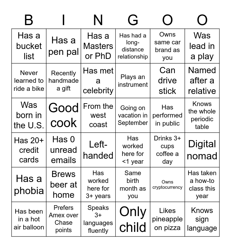 This bingo card has 36 words: Same birth month as you, Has worked here for 3+ years, Only child, Never learned to ride a bike, Has 20+ credit cards, Going on vacation in September, Recently handmade a gift, Speaks 3+ languages fluently, Owns same car brand as you, Owns cryptocurrency, Named after a relative, Has had a long-distance relationship, Has taken a how-to class this year, Good cook, Plays an instrument, Has a bucket list, Has a phobia, Has performed in public, Was born in the U.S., Has a Masters or PhD, From the west coast, Has 0 unread emails, Has worked here for <1 year, Left-handed, Drinks 3+ cups coffee a day, Has a pen pal, Can drive stick, Prefers Amex over Chase points, Has met a celebrity, Was lead in a play, Knows sign language, Has been in a hot air balloon, Digital nomad, Knows the whole periodic table, Brews beer at home and Likes pineapple on pizza.