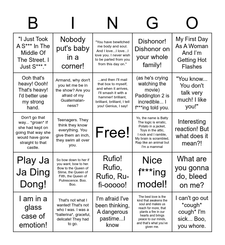This bingo card has a free space and 24 words: So bow down to her if you want, bow to her. Bow to the Queen of Slime, the Queen of Filth, the Queen of Putrescence. Boo. Boo., That's not what I wanted! That's not who I was. I was a *ballerina*, graceful, delicate! They had to go., ...and then I'll mail that box to myself, and when it arrives, I'll smash it with a hammer! brilliant, brilliant, brilliant, I tell you! Genius, I say!, I am in a glass case of emotion!, My First Day As A Woman And I’m Getting Hot Flashes, "I Just Took A S*** In The Middle Of The Street. I Just S***.", Ooh that's heavy! Oooh! That's heavy! I'd better use my strong hand., Nobody put's baby in a corner!, Yo, the name is Batty The logic is erratic, Potato in a jacket, Toys in the attic, I rock and I ramble, My brain is scrambled, Rap like an animal but I'm a mammal, Rufio! Rufio, Rufio, Ru-fi-ooooo!, (as he's crying watching the movie) Paddington 2 is incredible... I f***ing told you., Don't go that way... *groan* If she had kept on going that way she would have gone straight to that castle., Nice f***ing model!, What are you gonna do, bleed on me?, Armand, why don't you let me be in the show? Are you afraid of my Guatemalan-ness?, The best love is the kind that awakens the soul and makes us reach for more, that plants a fire in our hearts and brings peace to our minds, and that’s what you’ve given me., Interesting reaction! But what does it mean?!, "You have bewitched me body and soul. And I love...I love...I love you. I never wish to be parted from you from this day on.", "You know... You don't talk very much! I like you!", Teenagers. They think they know everything. You give them an inch, they swim all over you., I can't go out *cough* cough* I'm sick... Boo, you whore., Play Ja Ja Ding Dong!, Dishonor! Dishonor on your whole family! and I'm afraid I've been thinking, A dangerous pastime...I know.