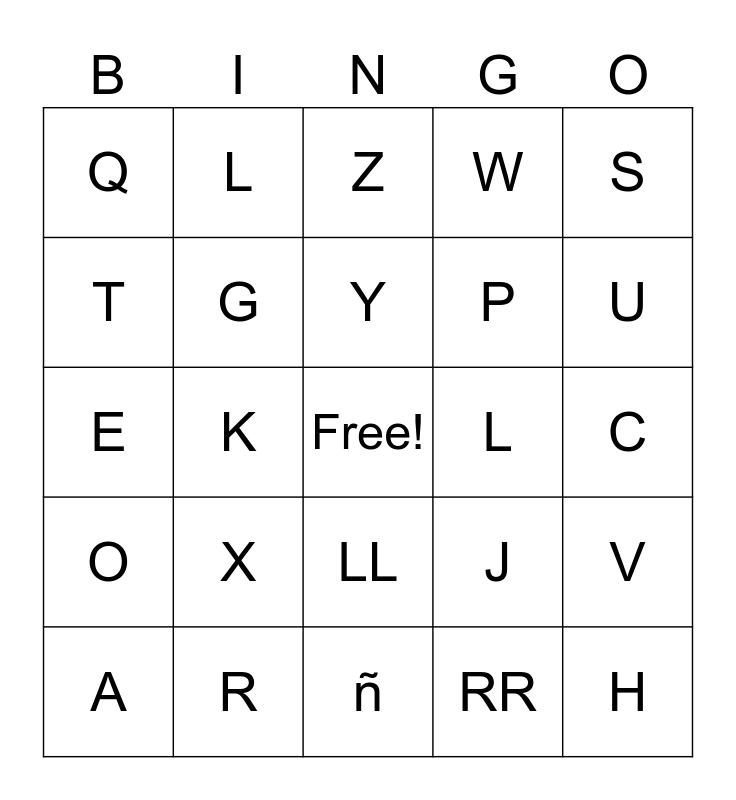 This bingo card has a free space and 29 words: A, F, K, N, Q, Z, G, X, L, R, C, H, ñ, RR, U, I, LL, O, S, E, J, M, P, T, W, L, V, Y and CH.