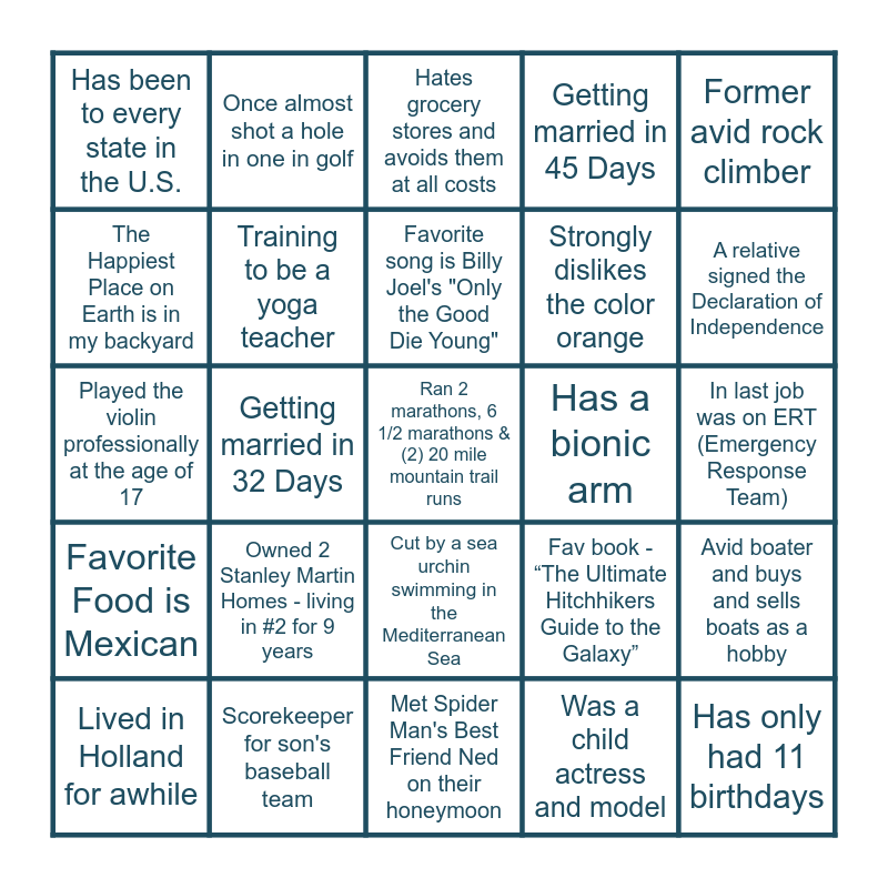 This bingo card has 36 words: Addicted to pickleball, Been on Marine One, Caught a 300lb tuna, Training to be a yoga teacher, Fav book - “The Ultimate Hitchhikers Guide to the Galaxy”, Favorite Food is Mexican, Favorite song is Billy Joel's "Only the Good Die Young", Finished 2nd to Dustin Johnson in a golf tournament, Former avid rock climber, Gets a haircut every Tuesday, Getting married in 32 Days, Getting married in 45 Days, Has 3 Daughters, Has a bionic arm, A relative signed the Declaration of Independence, Has been to every state in the U.S., Has only had 11 birthdays, Owned 2 Stanley Martin Homes - living in #2 for 9 years, Ran 2 marathons, 6 1/2 marathons & (2) 20 mile mountain trail runs, Hates grocery stores and avoids them at all costs, In last job was on ERT (Emergency Response Team), Avid boater and buys and sells boats as a hobby, Scorekeeper for son's baseball team, Lived in Holland for awhile, Met Spider Man's Best Friend Ned on their honeymoon, Once almost shot a hole in one in golf, Played the violin professionally at the age of 17, Plays the drums, Strongly dislikes the color orange, The Happiest Place on Earth is in my backyard, Used to eat 8 raw eggs every morning, Used to play the violin, Was a child actress and model, Cut by a sea urchin swimming in the Mediterranean Sea, Has a patent and Can play the guitar.