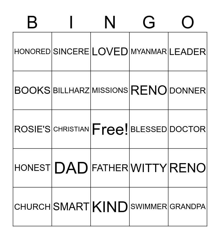 This bingo card has a free space and 24 words: DAD, SMART, MISSIONS, CHURCH, LEADER, HONORED, BOOKS, SINCERE, BLESSED, FATHER, RENO, ROSIE'S, WITTY, RENO, BILLHARZ, SWIMMER, DOCTOR, LOVED, DONNER, CHRISTIAN, GRANDPA, HONEST, MYANMAR and KIND.