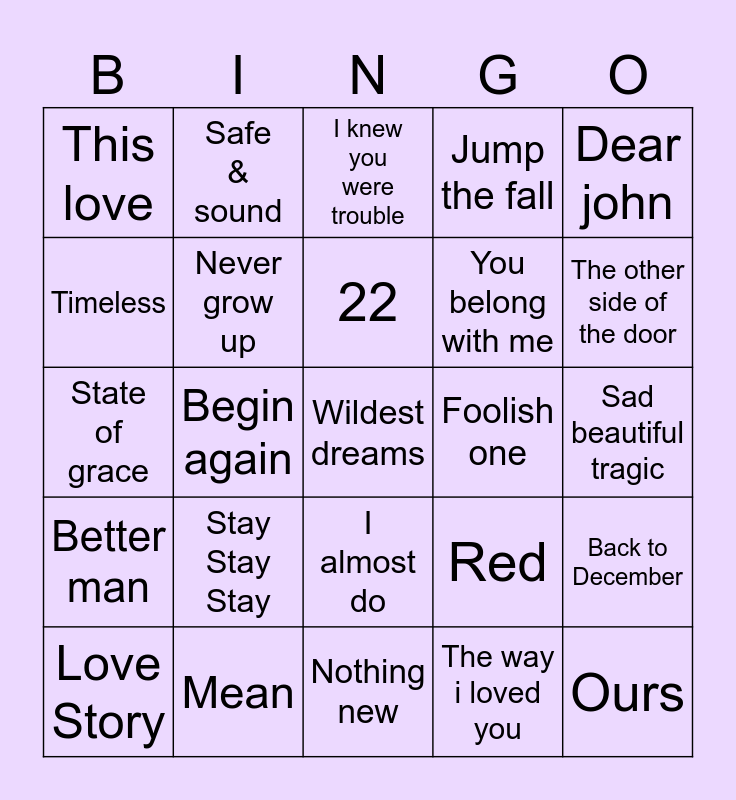 This bingo card has a free space and 24 words: Stay Stay Stay, Mean, 22, Love Story, Dear john, This love, Timeless, Safe & sound, Foolish one, I almost do, You belong with me, State of grace, Red, Back to December, Never grow up, The way i loved you, Sad beautiful tragic, I knew you were trouble, The other side of the door, Begin again, Ours, Better man, Jump the fall and Nothing new.