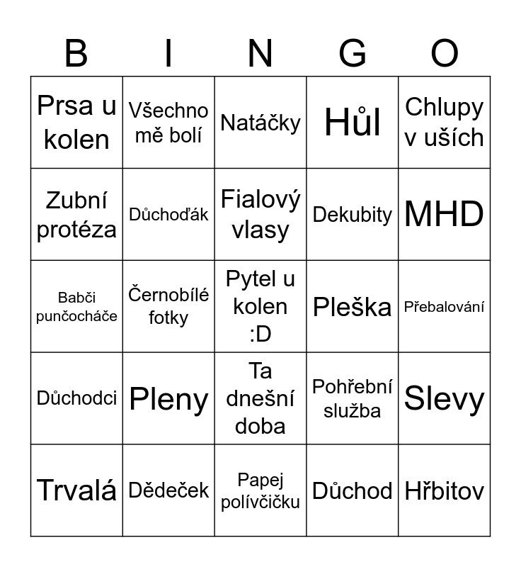 This bingo card has 59 words: Babička, Dědeček, Senior, Důchodci, Důchod, Domov seniorů, Důchoďák, LDNka, Dekubity, Chodítko, Hůl, Šišlání, Zubní protéza, Naslouchátko, Brýle, Prsa u kolen, Pytel u kolen :D, Chlupy v uších, Šediny, Fialový vlasy, Pleška, Natáčky, Trvalá, Slevy, Letáky, Nákupy, Taška na kolečkách, Síťovka, MHD, Doktor, Inkontinence, Cukrovka, Infarkt, Artróza, Všechno mě bolí, Léky, Vnoučata, Černobílé fotky, Dědova flanelka, Babči punčocháče, Zástěra, Pleny, Přebalování, Válka, To já ve tvým věku.., Co si to říkal?, Za našeho mládí, Ta dnešní mládež, Ta dnešní doba, Papej polívčičku, Tumáš, přidej si, Lavička v parku, Noviny, Krmení holubů, Sanitka, Pohřební služba, Pohřeb, Hřbitov and Smuteční hostina.