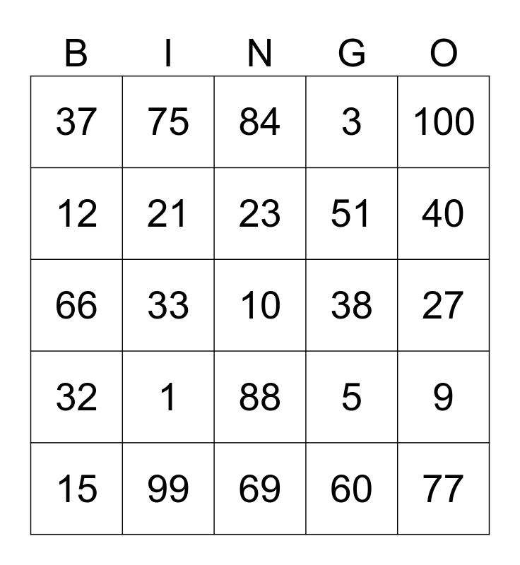 This bingo card has 25 words: 1, 69, 23, 15, 100, 37, 12, 75, 38, 88, 51, 66, 5, 9, 21, 77, 27, 84, 40, 33, 10, 99, 32, 3 and 60.