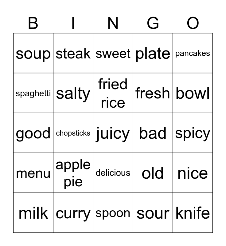 This bingo card has a free space and 24 words: apple pie, curry, fried rice, milk, pancakes, soup, spaghetti, steak, bad, delicious, fresh, good, old, nice, salty, sour, spicy, sweet, bowl, chopsticks, knife, menu, plate and spoon.