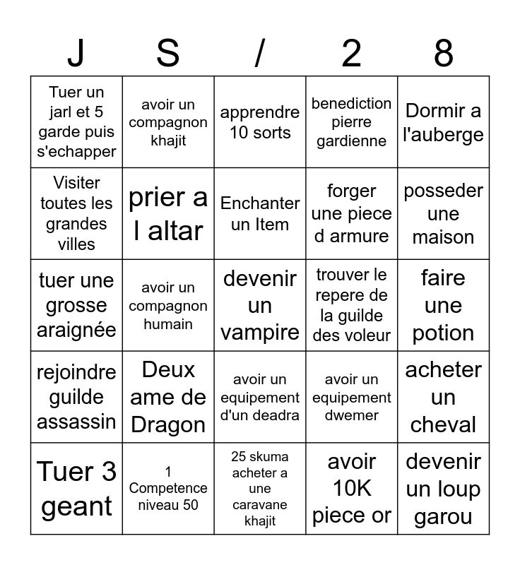 This bingo card has a free space and 24 words: Deux ame de Dragon, 1 Competence niveau 50, Enchanter un Item, Tuer 3 geant, Dormir a l'auberge, Tuer un jarl et 5 garde puis s'echapper, Visiter toutes les grandes villes, avoir un compagnon khajit, trouver le repere de la guilde des voleur, avoir un equipement d'un deadra, forger une piece d armure, tuer une grosse araignée, avoir un equipement dwemer, acheter un cheval, prier a l altar, avoir 10K piece or, faire une potion, apprendre 10 sorts, posseder une maison, avoir un compagnon humain, devenir un loup garou, rejoindre guilde assassin, benediction pierre gardienne and 25 skuma acheter a une caravane khajit.