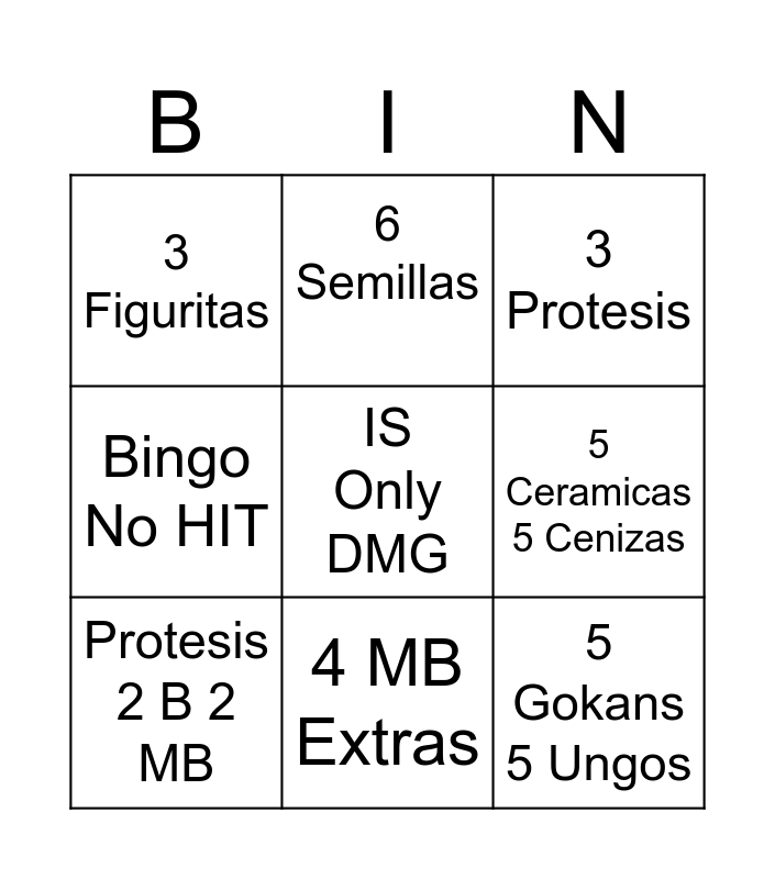 This bingo card has a free space and 8 words: 5 Ceramicas 5 Cenizas, 3 Protesis, 6 Semillas, Protesis 2 B 2 MB, 3 Figuritas, 5 Gokans 5 Ungos, Bingo No HIT and 4 MB Extras.