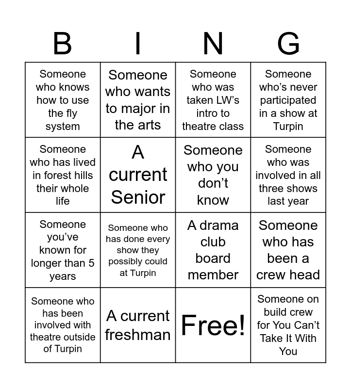 This bingo card has 17 words: Free!, Someone who has been involved with theatre outside of Turpin, Someone who was taken LW’s intro to theatre class, Someone who knows how to use the fly system, Someone who has done every show they possibly could at Turpin, Someone who’s never participated in a show at Turpin, Someone who has been a crew head, Someone who you don’t know, Someone who was involved in all three shows last year, A current Senior, A current freshman, A drama club board member, Someone who has lived in forest hills their whole life, Someone who wants to major in the arts, Someone you’ve known for longer than 5 years, Someone who has stage managed before and Someone on build crew for You Can’t Take It With You.