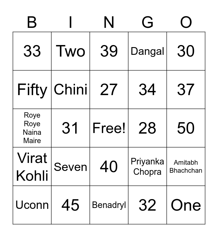 This bingo card has a free space and 50 words: Chef, One, Ladakh, Benadryl, Seven, Sushmita Sen, Two, Black, Fifty, Chemistry, Chini, Dangal, Amitabh Bhachchan, Priyanka Chopra, Deepika Padukone, 26, 27, 28, 29, 30, 31, 32, 33, 34, 35, 36, 37, 38, 39, 40, 41, 42, 43, 44, 45, 46, 47, 48, 49, 50, Turkey, Cricket, India, Carlos Alcaraz, Uconn, Roye Roye Naina Maire, Bhaayo Re Saibo, Mil gayi...aaj aasman se, Virat Kohli and Tengo tu foto.