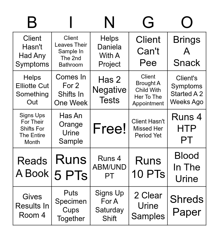 This bingo card has a free space and 24 words: Runs 5 PTs, Puts Specimen Cups Together, Has 2 Negative Tests, Gives Results In Room 4, Brings A Snack, Client Hasn't Had Any Symptoms, Helps Elliotte Cut Something Out, Client Leaves Their Sample In The 2nd Bathroom, Client Hasn't Missed Her Period Yet, Runs 4 ABM/UND PT, Client Brought A Child With Her To The Appointment, Signs Ups For Their Shifts For The Entire Month, Runs 10 PTs, Blood In The Urine, Comes In For 2 Shifts In One Week, 2 Clear Urine Samples, Runs 4 HTP PT, Helps Daniela With A Project, Client's Symptoms Started A 2 Weeks Ago, Has An Orange Urine Sample, Shreds Paper, Reads A Book, Client Can't Pee and Signs Up For A Saturday Shift.