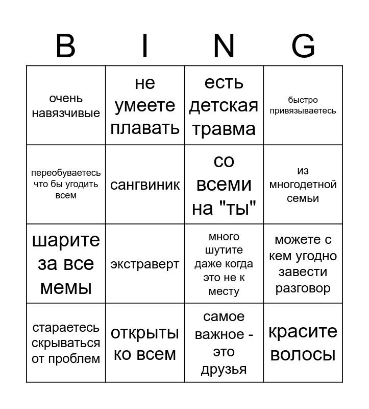 This bingo card has 16 words: открыты ко всем, можете с кем угодно завести разговор, есть детская травма, очень навязчивые, шарите за все мемы, не умеете плавать, много шутите даже когда это не к месту, самое важное - это друзья, переобуваетесь что бы угодить всем, сангвиник, стараетесь скрываться от проблем, быстро привязываетесь, экстраверт, из многодетной семьи, со всеми на "ты" and красите волосы.