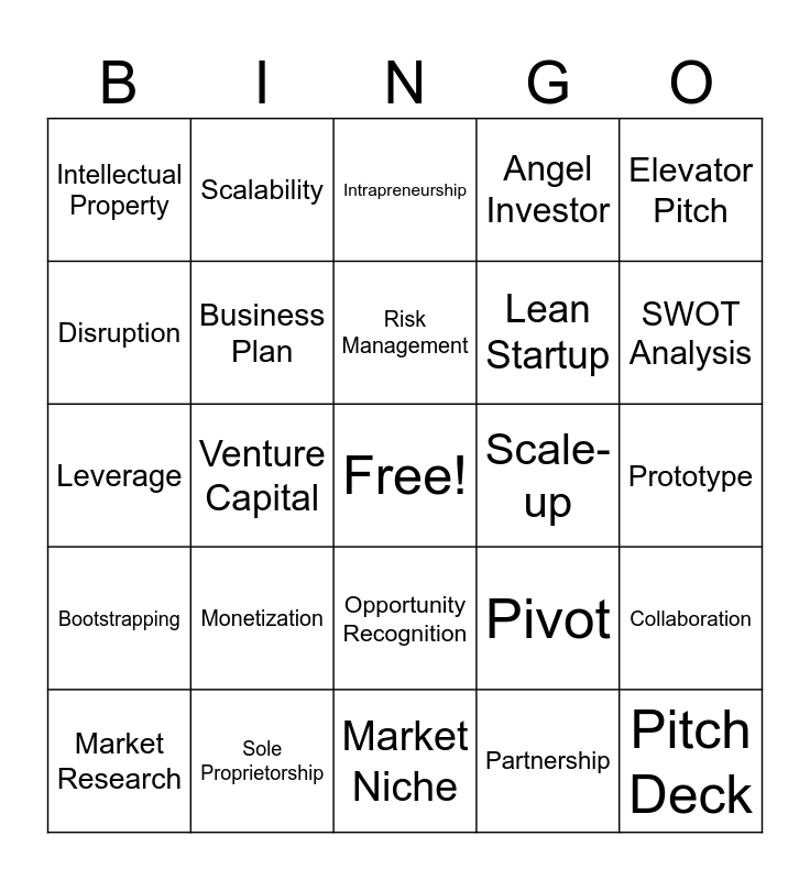This bingo card has a free space and 39 words: Entrepreneurship, Innovation, Start-up, Business Plan, Market Research, Opportunity Recognition, Risk Management, Value Proposition, Elevator Pitch, Bootstrapping, Venture Capital, Angel Investor, Pitch Deck, Prototype, Scale-up, Monetization, Exit Strategy, Intellectual Property, Networking, Pivot, Disruption, Market Niche, Lean Startup, SWOT Analysis, Incubator, Acceleration, Business Model Canvas, Cash Flow, Exit Strategy, Scalability, Sustainability, Franchise, Intrapreneurship, Sole Proprietorship, Partnership, Exit Strategy, Collaboration, Leverage and Crowdfunding.