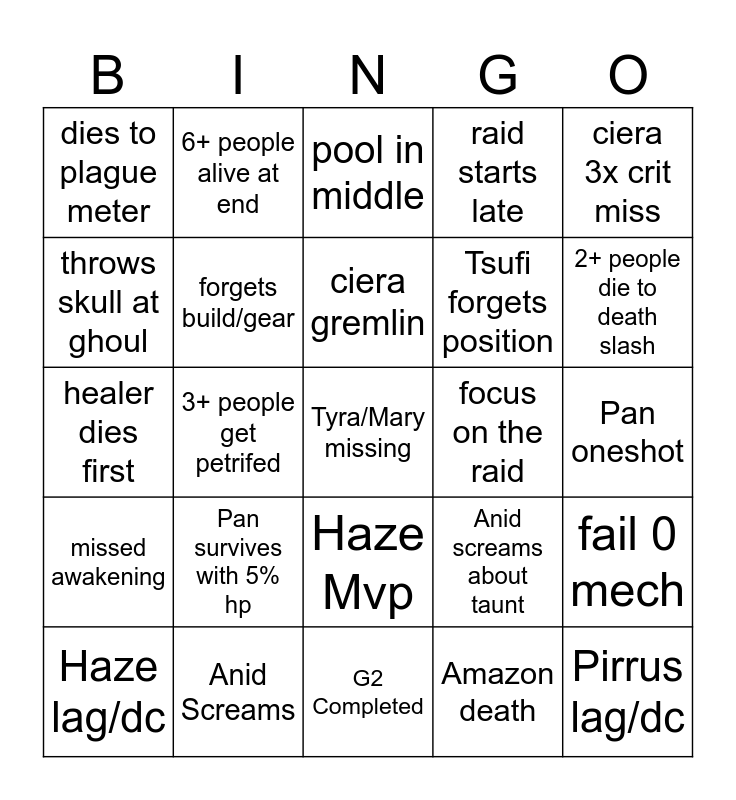 This bingo card has a free space and 24 words: Pan survives with 5% hp, Anid Screams, ciera gremlin, Haze lag/dc, ciera 3x crit miss, dies to plague meter, throws skull at ghoul, 6+ people alive at end, focus on the raid, Haze Mvp, Tsufi forgets position, healer dies first, Anid screams about taunt, fail 0 mech, forgets build/gear, Amazon death, Pan oneshot, pool in middle, 2+ people die to death slash, 3+ people get petrifed, Pirrus lag/dc, missed awakening, raid starts late and G2 Completed.