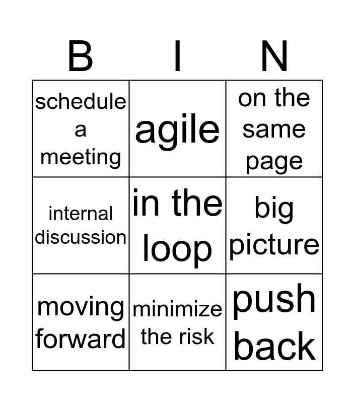 This bingo card has a free space and 8 words: big picture, on the same page, agile, moving forward, schedule a meeting, push back, internal discussion and minimize the risk.