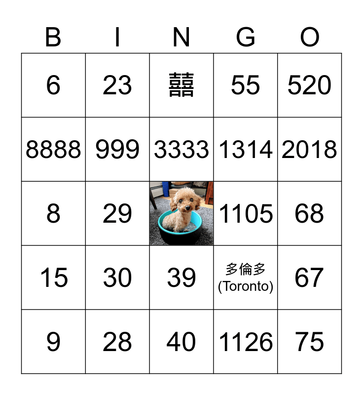 This bingo card has a free space and 75 words: 0904, 0101, 囍, 1994, 澳門(Macau), Ice Cream, 1009, 1206, 1126, 2022, 2023, 1, 1105, 2018, 牙買加(Jamaica), 999, 88, 多倫多(Toronto), 0926, 8888, 埃德蒙顿(Edmonton), 3333, 1314, 520, 6, 21, 35, 51, 66, 7, 22, 36, 52, 67, 8, 23, 37, 53, 68, 9, 24, 38, 54, 69, 10, 25, 39, 55, 70, 11, 26, 40, 56, 71, 12, 27, 41, 57, 72, 13, 28, 42, 58, 73, 14, 29, 43, 59, 74, 15, 30, 44, 60, 75 and 45.