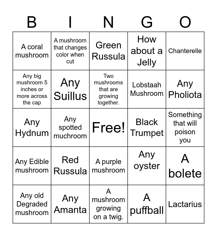 This bingo card has a free space and 24 words: Red Russula, Any Amanta, Two mushrooms that are growing together., Any old Degraded mushroom, Chanterelle, A coral mushroom, Any big mushroom 5 inches or more across the cap, A mushroom that changes color when cut, Black Trumpet, A purple mushroom, Lobstaah Mushroom, Any Hydnum, Any oyster, A bolete, Any Suillus, A puffball, Something that will poison you, Green Russula, Any Pholiota, Any spotted muchroom, Lactarius, Any Edible mushroom, How about a Jelly and A mushroom growing on a twig..