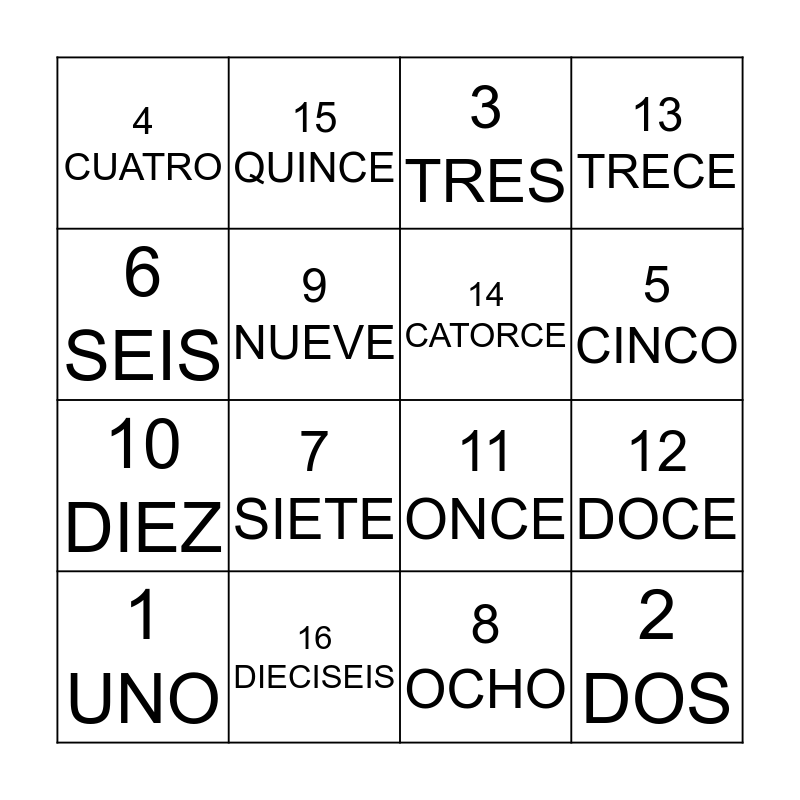 This bingo card has a free space and 15 words: 1 UNO, 2 DOS, 3 TRES, 4 CUATRO, 5 CINCO, 6 SEIS, 7 SIETE, 8 OCHO, 9 NUEVE, 10 DIEZ, 12 DOCE, 13 TRECE, 14 CATORCE, 15 QUINCE and 16 DIECISEIS.