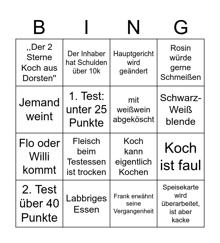 This bingo card has 16 words: Labbriges Essen, Koch ist faul, Hauptgericht wird geändert, ,,Der 2 Sterne Koch aus Dorsten'', Flo oder Willi kommt, Der Inhaber hat Schulden über 10k, Koch kann eigentlich Kochen, Frank erwähnt seine Vergangenheit, Jemand weint, 1. Test: unter 25 Punkte, 2. Test über 40 Punkte, Rosin würde gerne Schmeißen, Fleisch beim Testessen ist trocken, Schwarz-Weiß blende, mit weißwein abgeköscht and Speisekarte wird überarbeitet, ist aber kacke.