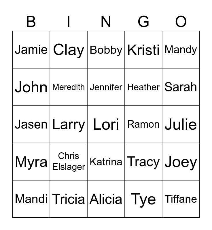 This bingo card has a free space and 24 words: Chris Elslager, Tricia, Jennifer, Mandi, Mandy, Jamie, John, Clay, Ramon, Katrina, Heather, Jasen, Tracy, Joey, Meredith, Tye, Julie, Bobby, Sarah, Larry, Tiffane, Myra, Kristi and Alicia.