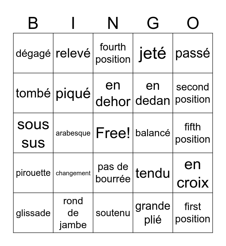This bingo card has a free space and 29 words: glissade, demi-plié, arabesque, chaîné, dégagé, fourth position, piqué, changement, balancé, rond de jambe, fifth position, first position, soutenu, grande plié, second position, battement, pas de bourrée, pirouette, passé, sous sus, tendu, third position, en dedan, tombé, jeté, relevé, en croix, en dehor and port de bras.