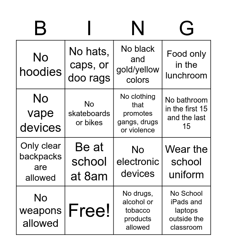 This bingo card has 16 words: Free!, Wear the school uniform, No black and gold/yellow colors, No hoodies, Only clear backpacks are allowed, No hats, caps, or doo rags, No electronic devices, No drugs, alcohol or tobacco products allowed, No vape devices, No skateboards or bikes, No weapons allowed, Food only in the lunchroom, Be at school at 8am, No bathroom in the first 15 and the last 15, No clothing that promotes gangs, drugs or violence and No School iPads and laptops outside the classroom.