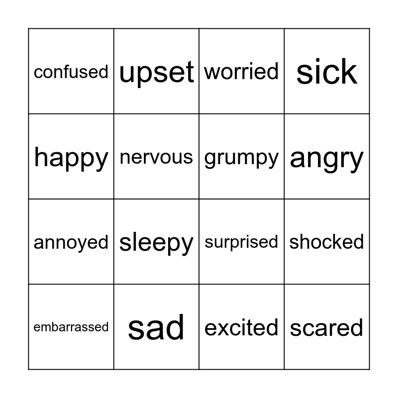 This bingo card has 16 words: sad, shocked, worried, confused, annoyed, upset, surprised, excited, happy, nervous, embarrassed, sick, sleepy, angry, grumpy and scared.