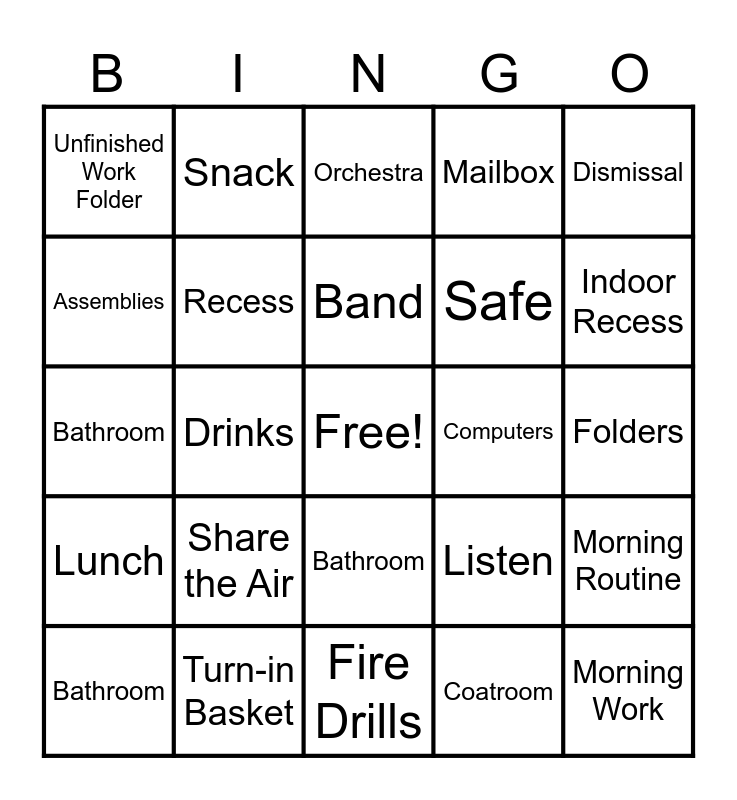 This bingo card has a free space and 32 words: Coatroom, Bathroom, Drinks, Hallway, Lunch, Recess, Dismissal, Morning Routine, Snack, Lessons, Band, Orchestra, Chorus, Specials, Computers, Pencil Sharpener, Bathroom, Bathroom, Bathroom, Share the Air, Listen, Bins, Folders, Turn-in Basket, Morning Work, Mailbox, Safe, Assemblies, Unfinished Work Folder, Fire Drills, Supply Center and Indoor Recess.