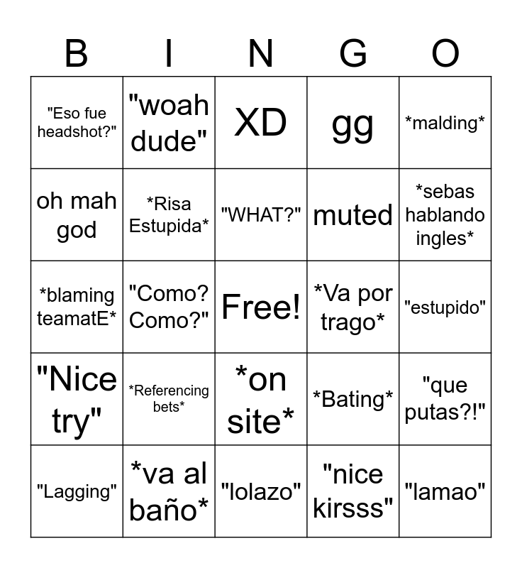 This bingo card has a free space and 29 words: "Lagging", "Imbecil", "Como?Como?", "Yo Le Di!", "Eso fue headshot?", XD, *Risa Estupida*, *Referencing bets*, *Va por trago*, *va al baño*, "estupido", "lamao", "lolazo", "nice kirsss", *sebas hablando ingles*, "stick it", *on site*, "Nice try", *malding*, *blaming teamatE*, *Bating*, UNNECESSARY SCREAIMING, muted, oh mah god, gg, "woah dude", "que putas?!", "WHAT?" and "NO WAY DUDE".