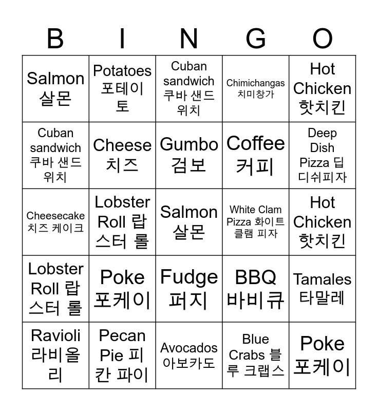 ⚠ This card has duplicate items: Salmon 살몬 (2), Coffee 커피 (2), Avocados 아보카도 (2), Poke 포케이 (2), Deep Dish Pizza 딥디쉬피자 (2), Potatoes 포테이토 (2), Ravioli 라비올리 (2), Cuban sandwich 쿠바 샌드위치 (2), Sweet Corn 스위트 콘 (2), Cheese 치즈 (2), Chimichangas 치미창가 (2), Tamales 타말레 (2), BBQ 바비큐 (2), Pecan Pie 피칸 파이 (2), Peaches 피치 (2), Gumbo 검보 (2), White Clam Pizza 화이트 클램 피자 (2), Key Lime Pie 키 라임 파이 (2), Hot Chicken 핫치킨 (2), Lobster Roll 랍스터 롤 (2), Blue Crabs 블루 크랩스 (2)