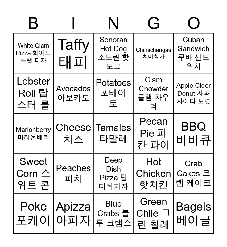 This bingo card has 39 words: Free!, Salmon 살몬, Coffee 커피, Avocados 아보카도, Poke 포케이, Deep Dish Pizza 딥디쉬피자, Potatoes 포테이토, Ravioli 라비올리, Cuban Sandwich 쿠바 샌드위치, Sweet Corn 스위트 콘, Cheese 치즈, Chimichangas 치미창가, Tamales 타말레, BBQ 바비큐, Pecan Pie 피칸 파이, Peaches 피치, Gumbo 검보, White Clam Pizza 화이트 클램 피자, Key Lime Pie 키 라임 파이, Hot Chicken 핫치킨, Lobster Roll 랍스터 롤, Blue Crabs 블루 크랩스, Clam Chowder 클램 차우더, Apple Cider Donut 사과 사이다 도넛, Cheesesteak 치즈 스테이크, Cheesecake 치즈 케이크, Bagels 베이글, Thin Crust Pizza 띤 크러스트 피자, Fudge 퍼지, Taffy 태피, Hamburger 햄버거, Ribs 리브, Sonoran Hot Dog 소노란 핫도그, Apizza 아피자, Green Chile 그린 칠레, Oysters 오이스털, Crab Cakes 크랩 케이크, Marionberry 마리온베리 and Buckeye 벅카이.