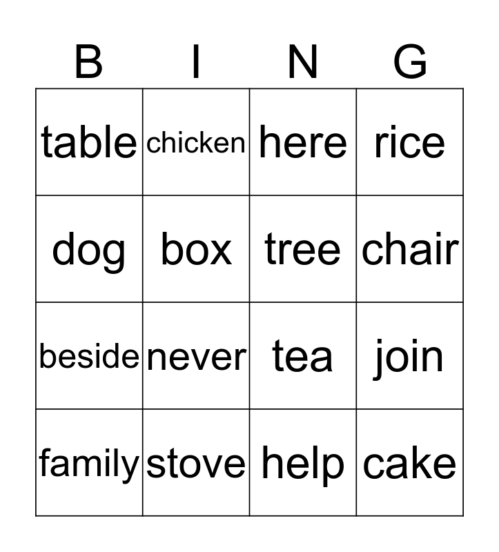 This bingo card has a free space and 29 words: shoes, apple, join, book, table, here, tree, mango, stove, although, help, family, make, cat, never, shirt, kitchen, dress, dog, cake, there, lamp, beside, box, rice, chicken, go, chair and behind.