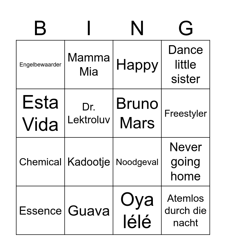 This bingo card has 59 words: 10.000 luchtballonnen, Amalia, André Hazes, Atemlos durch die nacht, Beat it, Bruce Springsteen, Bruno Mars, Can't hold us, Chemical, Coldplay, Dance little sister, De mooiste van het jaar, Dr. Lektroluv, Elvis Presley, Eminem, Engelbewaarder, Essence, Esta Vida, Flowers, Freestyler, Guava, Happy, Hey Gringo, Hey Rosie, Hotel California, Huisje op wielen, I gotta feeling, Joost, Kadootje, Koffie of thee, La historia, Leuthse kermis, Mac Miller, Mambo no.5, Mamma Mia, Michael Bublé, Mr. Brightside, Never going home, Nobody's wife, Noodgeval, Oasis, One Direction, Oya lélé, Pump it up, Pyramids, Queen, Radar Love, Red Hot Chili Peppers, Scar Tissue, Schultenbräu, Sterrenstof, Taylor Swift, The Seed (2.0), The Weeknd, Tom Jones, Turn up the love, U2, Viva la Vida and Vivir mi vada.