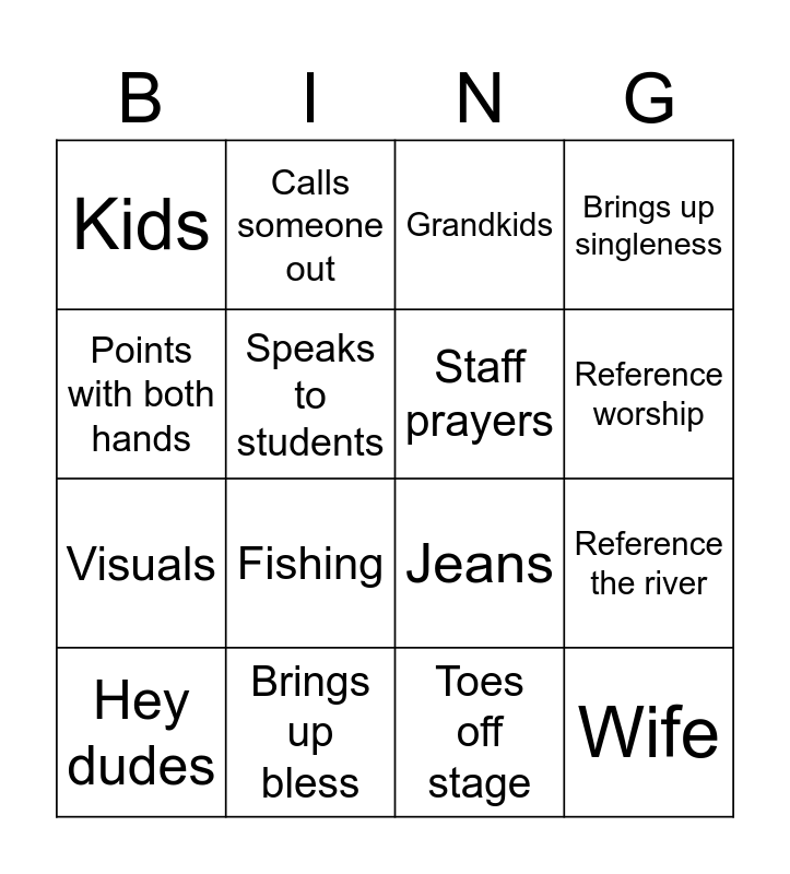 This bingo card has 18 words: Fishing, Wife, Grandkids, Kids, Jeans, Brings up singleness, Hey dudes, Calls someone out, Reference worship, Visuals, Toes off stage, Points with both hands, Reference the river, Speaks to students, Staff prayers, Give me your eyes, Brings up bless and Brings up serving.