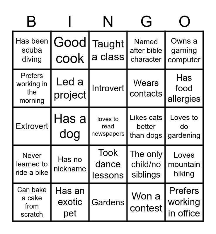 This bingo card has 101 words: Free!, Met a celebrity, Owns a gaming computer, Knows how to swim, Likes pineapple on pizza, Been to Disney, Loves roller coasters, Can Ride horses, Knows martial arts, Attended a concert, Has been on a road trip, Screams during scary movies, Loves karaoke, A song leader, Wearing black socks, Same birth month as you, Never learned to ride a bike, Collects something, Recently handmade a gift, Has a BFF from high school, Currently a Bible school student, Currently a senior pastor, Listens to podcasts, Travels often, Attended high school reunion, Has food allergies, Named after bible character, Has no nickname, Birthday is on a holiday, Makes New Year’s resolutions, Good cook, Taught a class, Helped a stranger, Got help from a stranger, Worked at a family business, Took dance lessons, Speaks 3+ languages, Can code, Won a contest, Gardens, Traveled in the last year, Can bake a cake from scratch, Was in a wedding party this year, Climbed a mountain, Lives near a coffee shop, loves to read newspapers, A comedian preacher in church, Loves to watch documentaries, Prefers remote work, Prefers working in office, Drinks 3+ cups coffee a day, Prefers working in the morning, Prefers working at night, Has had an 1hr+ commute, Bikes to work, Buys coffee every morning, Works out after work, A mentor at work/church, Part of a professional group, Was promoted this year, Led a project, Only child, Comes from a big family, Plays a musical instrument, Read 10+ books this year, Wears contacts, Has a cat, Has a dog, Has an exotic pet, Runs regularly, Has an unusual hobby, Has officiated a wedding, Has been scuba diving, Vegetarian, Introvert, Extrovert, Creates art, Enjoys meeting new people, Got engaged this year, Got married this year, Quit a bad habit recently, Grew up in this city, Likes cats better than dogs, Likes dogs better than cats, Loves to watch sports, Loves to travel, Loves to do gardening, Checks facebook daily, Is the youngest child, Is the eldest child, The only child/no siblings, Loves to watch the news on tv, Hates to watch the news on tv, Sings in the shower or bathtub, Loves to shop online, Loves mountain hiking, Loves to walk, Is left handed, Is right handed, Does not drink soda and Wears contact lenses.