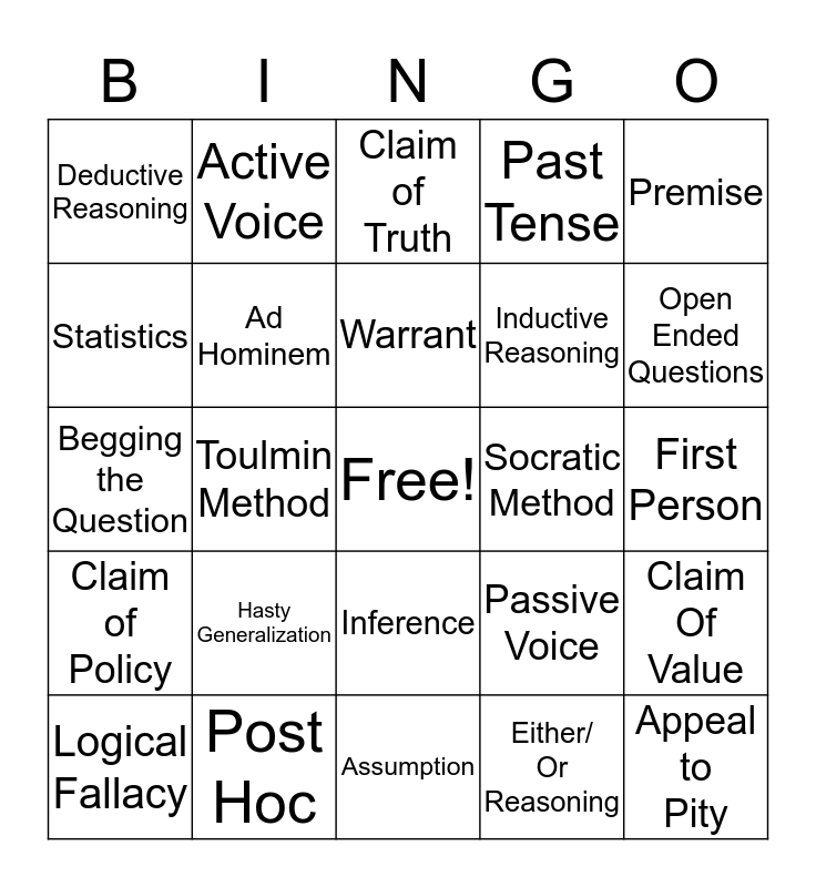 This bingo card has a free space and 24 words: Hasty Generalization, Post Hoc, Warrant, Logical Fallacy, Premise, Deductive Reasoning, Statistics, Active Voice, Socratic Method, Inference, Inductive Reasoning, Begging the Question, Passive Voice, Claim Of Value, Ad Hominem, Either/ Or Reasoning, First Person, Claim of Truth, Open Ended Questions, Toulmin Method, Appeal to Pity, Claim of Policy, Past Tense and Assumption.
