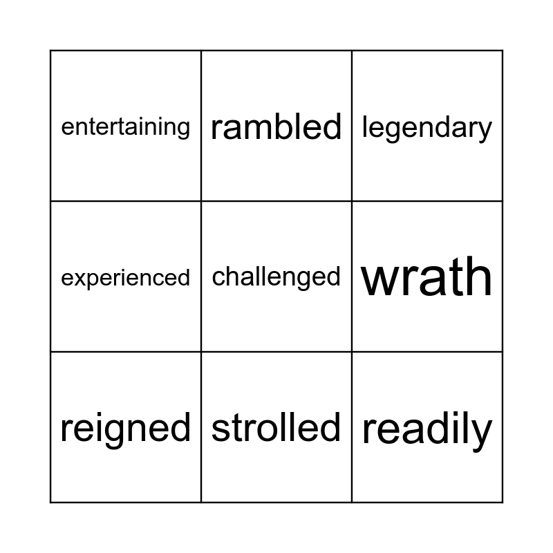 This bingo card has 9 words: reigned, legendary, rambled, experienced, entertaining, wrath, challenged, readily and strolled.