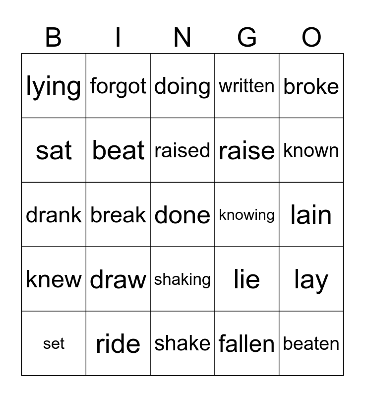 This bingo card has 36 words: Free!, did, rising, raise, lay, set, beat, wrote, written, rode, drank, forgot, shaking, fallen, lain, lying, ride, doing, lie, broke, knew, draw, raised, sat, beaten, sat, break, shake, knowing, known, forgot, fell, done, went, riding and ridden.