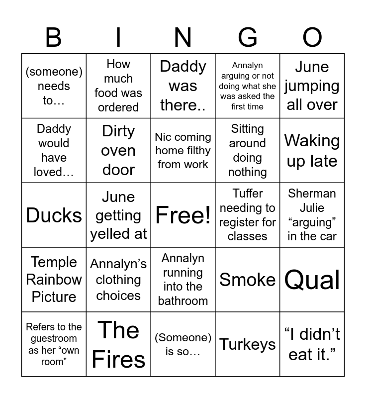 This bingo card has a free space and 24 words: Annalyn’s clothing choices, The Fires, Nic coming home filthy from work, Refers to the guestroom as her “own room”, June jumping all over, (someone) needs to…, Daddy would have loved…, How much food was ordered, Tuffer needing to register for classes, Annalyn running into the bathroom, Sitting around doing nothing, Ducks, Smoke, Qual, Dirty oven door, Turkeys, Sherman Julie “arguing” in the car, Daddy was there.., Waking up late, June getting yelled at, “I didn’t eat it.”, Temple Rainbow Picture, Annalyn arguing or not doing what she was asked the first time and (Someone) is so….