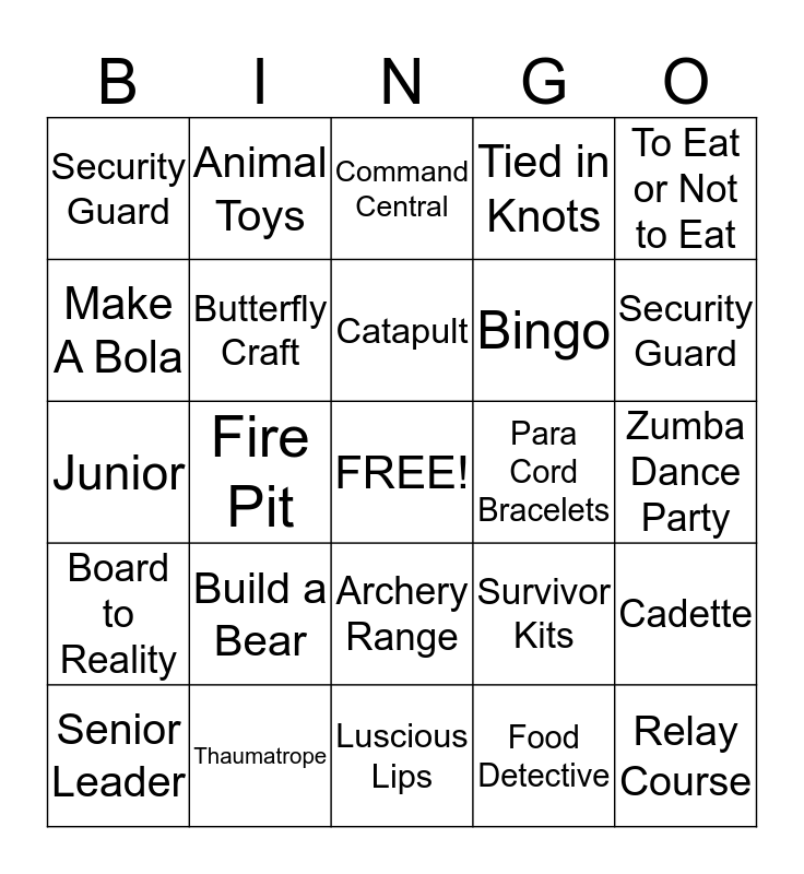 This bingo card has a free space and 24 words: Build a Bear, Thaumatrope, Catapult, Senior Leader, To Eat or Not to Eat, Security Guard, Make A Bola, Animal Toys, Para Cord Bracelets, Archery Range, Bingo, Junior, Survivor Kits, Cadette, Butterfly Craft, Food Detective, Zumba Dance Party, Command Central, Security Guard, Fire Pit, Relay Course, Board to Reality, Tied in Knots and Luscious Lips.