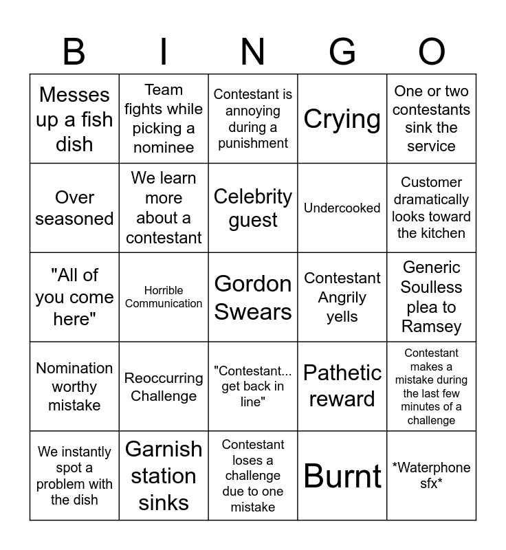 This bingo card has a free space and 24 words: Reoccurring Challenge, Garnish station sinks, Celebrity guest, We instantly spot a problem with the dish, One or two contestants sink the service, Messes up a fish dish, Over seasoned, Team fights while picking a nominee, Contestant Angrily yells, "Contestant... get back in line", Undercooked, "All of you come here", Pathetic reward, Contestant makes a mistake during the last few minutes of a challenge, We learn more about a contestant, Burnt, Generic Soulless plea to Ramsey, Contestant is annoying during a punishment, Customer dramatically looks toward the kitchen, Horrible Communication, *Waterphone sfx*, Nomination worthy mistake, Crying and Contestant loses a challenge due to one mistake.