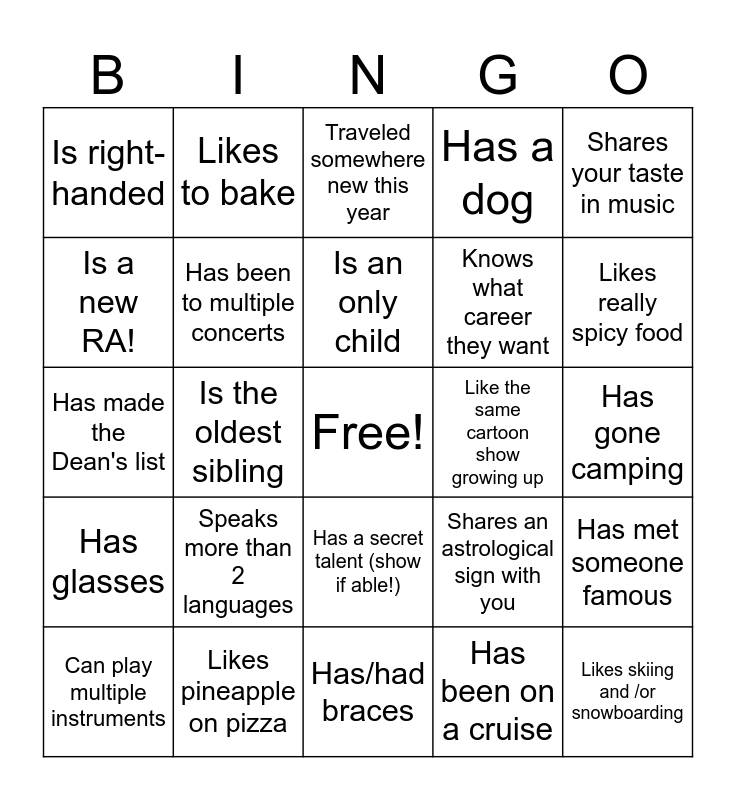 This bingo card has a free space and 24 words: Speaks more than 2 languages, Likes pineapple on pizza, Is an only child, Can play multiple instruments, Shares your taste in music, Is right-handed, Is a new RA!, Likes to bake, Like the same cartoon show growing up, Has a secret talent (show if able!), Knows what career they want, Has made the Dean's list, Shares an astrological sign with you, Has met someone famous, Has been to multiple concerts, Has been on a cruise, Has gone camping, Traveled somewhere new this year, Likes really spicy food, Is the oldest sibling, Likes skiing and /or snowboarding, Has glasses, Has a dog and Has/had braces.