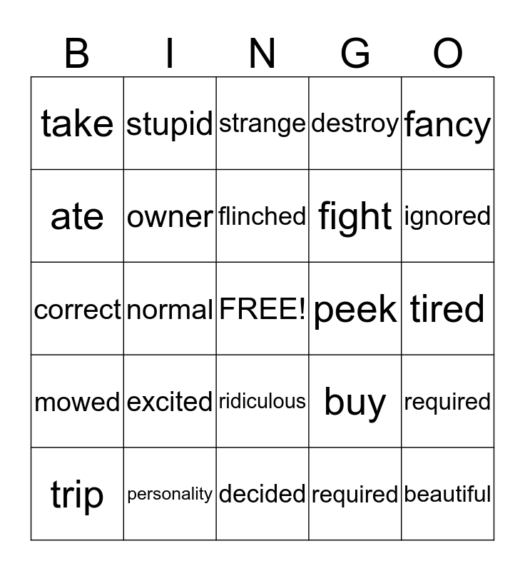 This bingo card has a free space and 24 words: excited, personality, flinched, trip, fancy, take, ate, stupid, peek, ridiculous, fight, correct, buy, required, owner, required, tired, strange, ignored, normal, beautiful, mowed, destroy and decided.