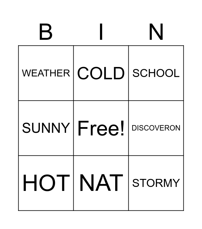 This bingo card has a free space and 14 words: WINDY, FOGGY, HOT, COLD, SUNNY, STORMY, RAINY, SNOWY, NAT, WEATHER, ENGLISH, DISCOVERON, SCHOOL and BUCK.