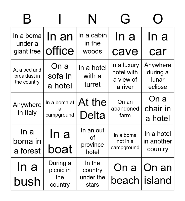 This bingo card has a free space and 24 words: In a bush, In a boat, In a hotel with a turret, On a beach, In a car, In a boma under a giant tree, In an office, In a cabin in the woods, On an abandoned farm, On a chair in a hotel, Anywhere in Italy, On a sofa in a hotel, In a boma not in a campground, In a hotel in another country, At a bed and breakfast in the country, During a picnic in the country, In the country under the stars, In a cave, Anywhere during a lunar eclipse, In a boma in a forest, In a boma at a campground, In an out of province hotel, In a luxury hotel with a view of a river and On an island.