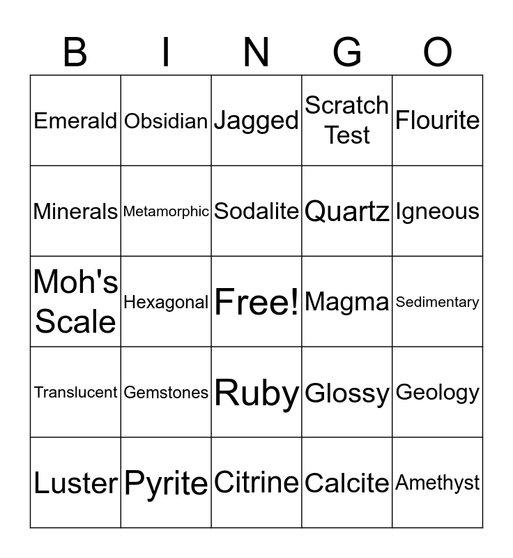 This bingo card has a free space and 24 words: Gemstones, Pyrite, Sodalite, Luster, Flourite, Emerald, Minerals, Obsidian, Magma, Ruby, Quartz, Moh's Scale, Glossy, Geology, Metamorphic, Calcite, Sedimentary, Jagged, Igneous, Hexagonal, Amethyst, Translucent, Scratch Test and Citrine.