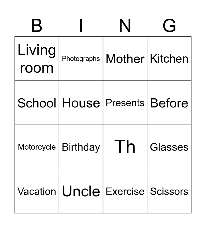 This bingo card has 25 words: Ch, Sh, Th, Nephew, Living room, Photographs, Mother, Kitchen, Motorcycle, Birthday, Exercise, Glasses, Questions, Uncle, Presents, Adventure, Vacation, House, Zoo, Scissors, School, Chimney, Anything, Before and Chuckled.