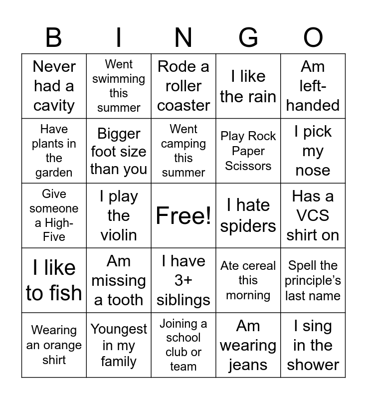 This bingo card has a free space and 24 words: Am missing a tooth, Youngest in my family, Went camping this summer, Wearing an orange shirt, Am left-handed, Never had a cavity, Have plants in the garden, Went swimming this summer, I hate spiders, I have 3+ siblings, Play Rock Paper Scissors, Give someone a High-Five, Ate cereal this morning, Spell the principle’s last name, Bigger foot size than you, Am wearing jeans, Has a VCS shirt on, Rode a roller coaster, I pick my nose, I play the violin, I sing in the shower, I like to fish, I like the rain and Joining a school club or team.
