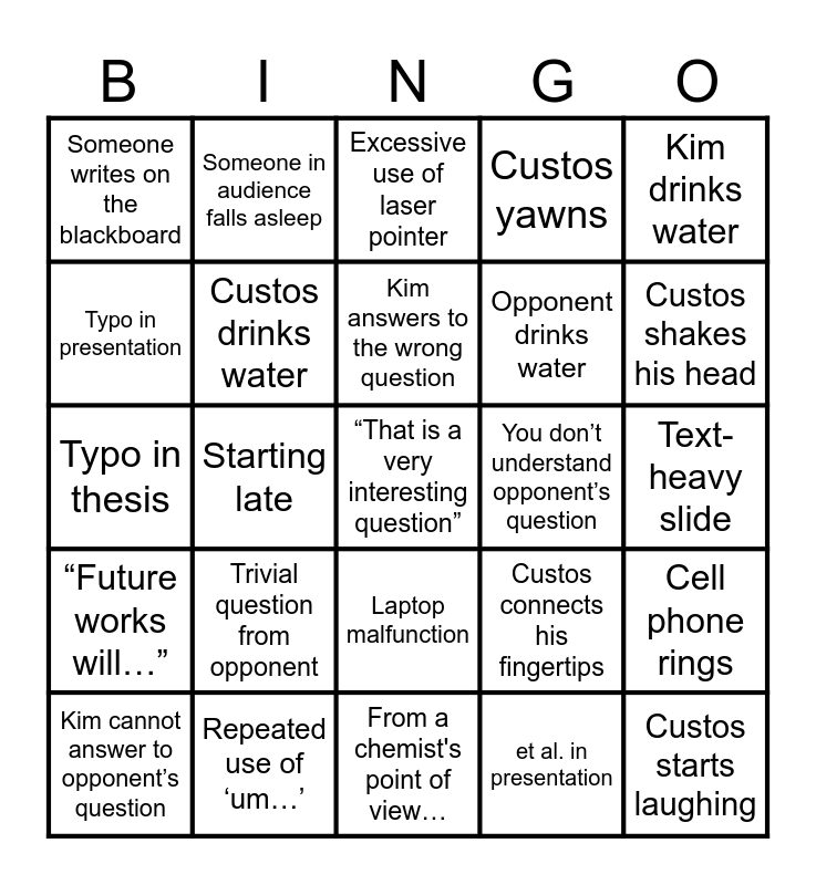 This bingo card has 25 words: Trivial question from opponent, From a chemist's point of view…, Kim answers to the wrong question, Kim cannot answer to opponent’s question, Kim drinks water, Someone writes on the blackboard, Typo in presentation, Someone in audience falls asleep, You don’t understand opponent’s question, Laptop malfunction, Opponent drinks water, Typo in thesis, Custos connects his fingertips, Cell phone rings, Custos drinks water, Custos starts laughing, Text-heavy slide, Excessive use of laser pointer, Custos shakes his head, Starting late, “That is a very interesting question”, Repeated use of ‘um…’, “Future works will…”, Custos yawns and et al. in presentation.