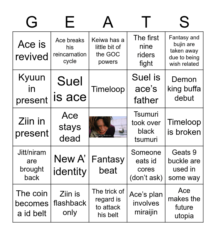 This bingo card has a free space and 24 words: New A’ identity, Ziin is flashback only, Timeloop, The coin becomes a id belt, Fantasy and bujin are taken away due to being wish related, Ace is revived, Kyuun in present, Ace breaks his reincarnation cycle, Tsumuri took over black tsumuri, Fantasy beat, Suel is ace’s father, Ziin in present, Someone eats id cores (don’t ask), Geats 9 buckle are used in some way, Suel is ace, Ace’s plan involves miraijin, Timeloop is broken, Keiwa has a little bit of the GOC powers, Demon king buffa debut, Ace stays dead, Ace makes the future utopia, Jitt/niram are brought back, The first nine riders fight and The trick of regard is to attack his belt.