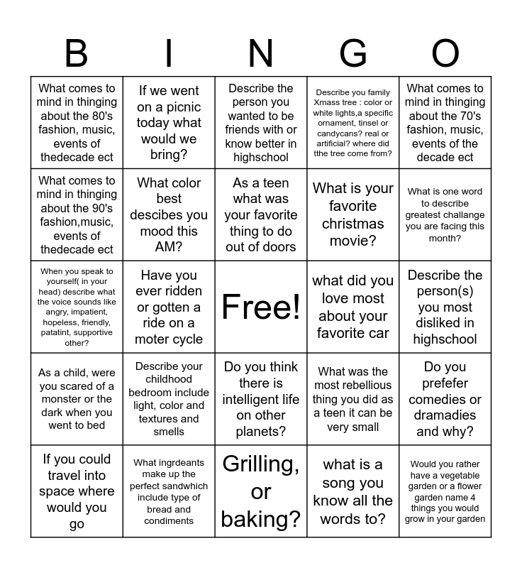This bingo card has a free space and 24 words: Describe your childhood bedroom include light, color and textures and smells, What ingrdeants make up the perfect sandwhich include type of bread and condiments, As a teen what was your favorite thing to do out of doors, If you could travel into space where would you go, What comes to mind in thinging about the 70's fashion, music, events of the decade ect, What comes to mind in thinging about the 80's fashion, music, events of thedecade ect, What comes to mind in thinging about the 90's fashion,music, events of thedecade ect, If we went on a picnic today what would we bring?, what did you love most about your favorite car, Do you think there is intelligent life on other planets?, What is your favorite christmas movie?, When you speak to yourself( in your head) describe what the voice sounds like angry, impatient, hopeless, friendly, patatint, supportive other?, What was the most rebellious thing you did as a teen it can be very small, Do you prefefer comedies or dramadies and why?, What color best descibes you mood this AM?, what is a song you know all the words to?, Describe the person(s) you most disliked in highschool, Describe the person you wanted to be friends with or know better in highschool, What is one word to describe greatest challange you are facing this month?, Have you ever ridden or gotten a ride on a moter cycle, Would you rather have a vegetable garden or a flower garden name 4 things you would grow in your garden, As a child, were you scared of a monster or the dark when you went to bed, Describe you family Xmass tree : color or white lights,a specific ornament, tinsel or candycans? real or artificial? where did tthe tree come from? and Grilling, or baking?.